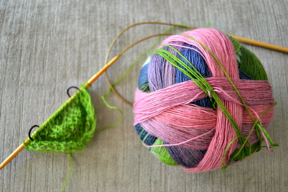 Numa visita ao Porto em meados de Março passei pela loja da Ovelha Negra e encantei-me com as lãs que lá encontrei. Trouxe alguns novelos de Olívia para um terceiro xaile que já comecei entretanto (esta coisa de fazer xailes está a tornar-se um vício).
